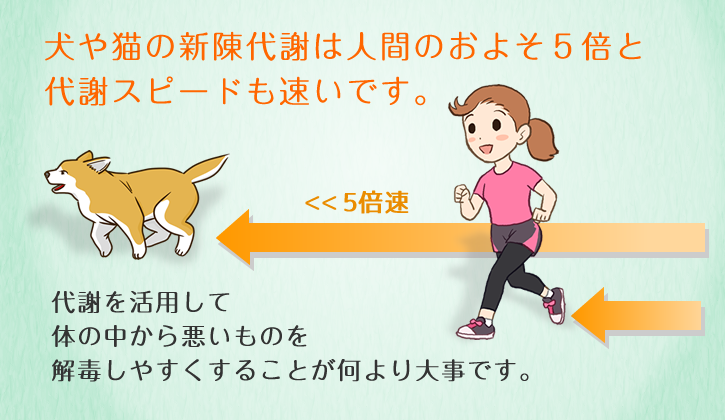 犬や猫の新陳代謝は人間のおよそ5倍と代謝スピードも速いため、代謝を活用して体の中から悪いものを解毒しやすくすることが何より大事です。