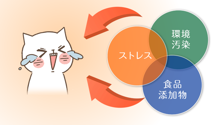 犬や猫の病気は、 人間が病気になるのと同じように、ストレス、環境汚染物質、食品添加物などが関係しています。